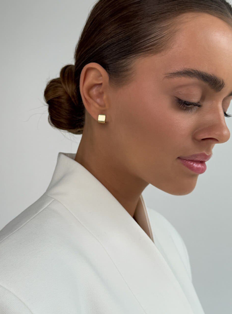 Cercei în formă de pătrate voluminoase, cu muchii late. Atracția principală este culoarea și strălucirea aurului, evidențiate de forma simplă a bijuteriei.