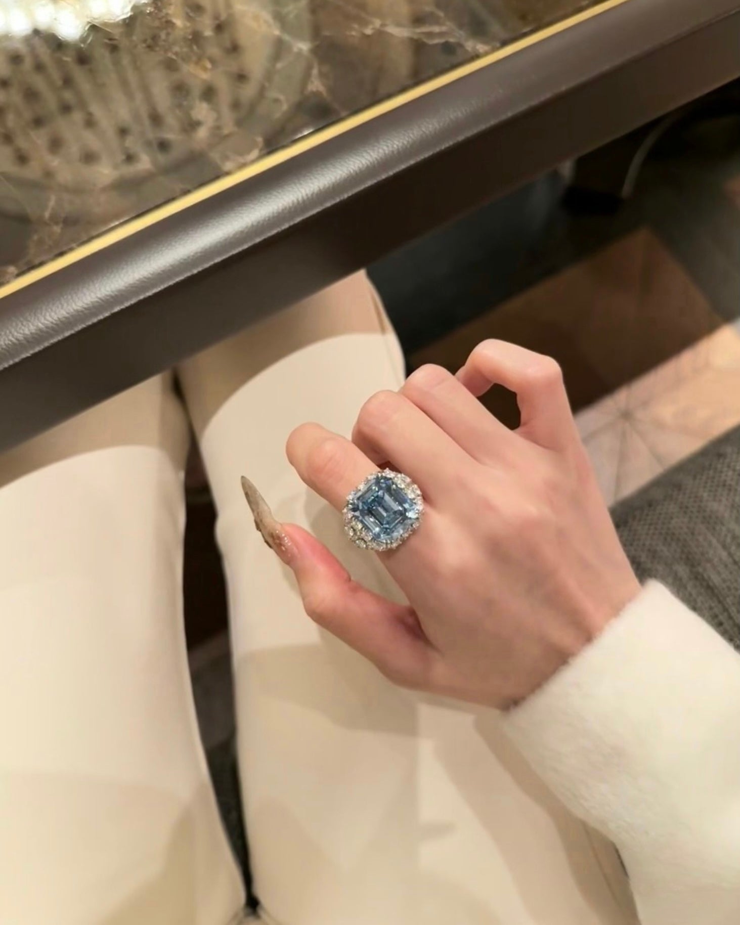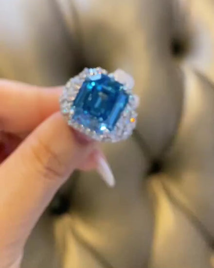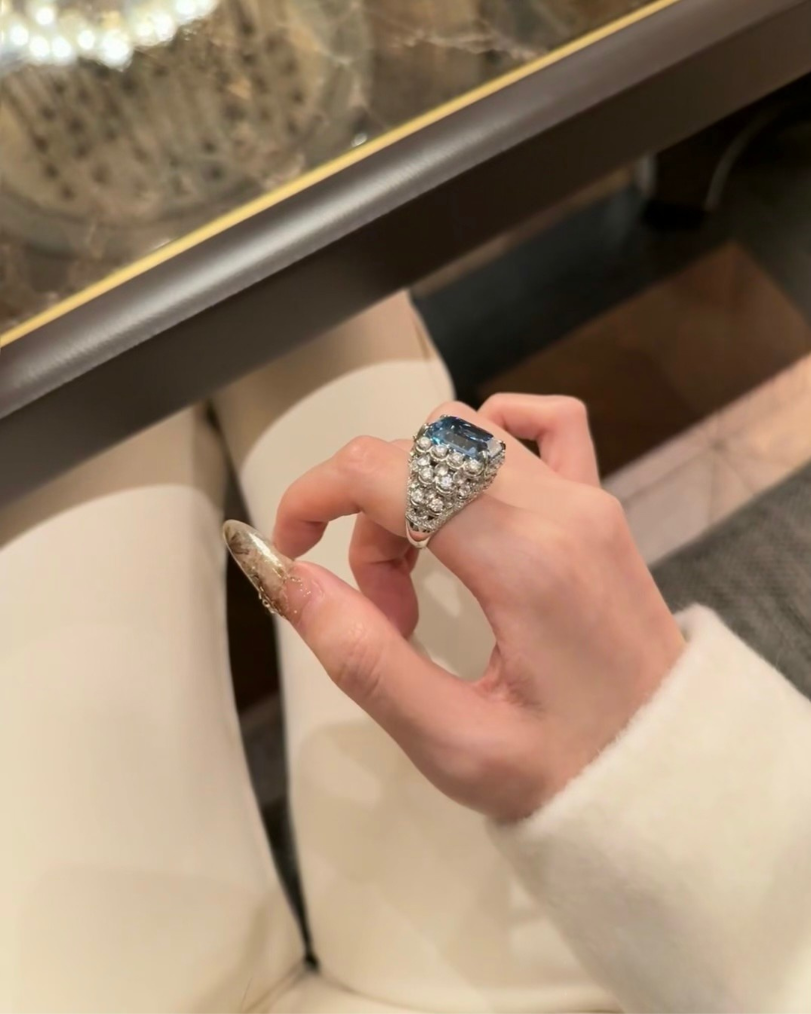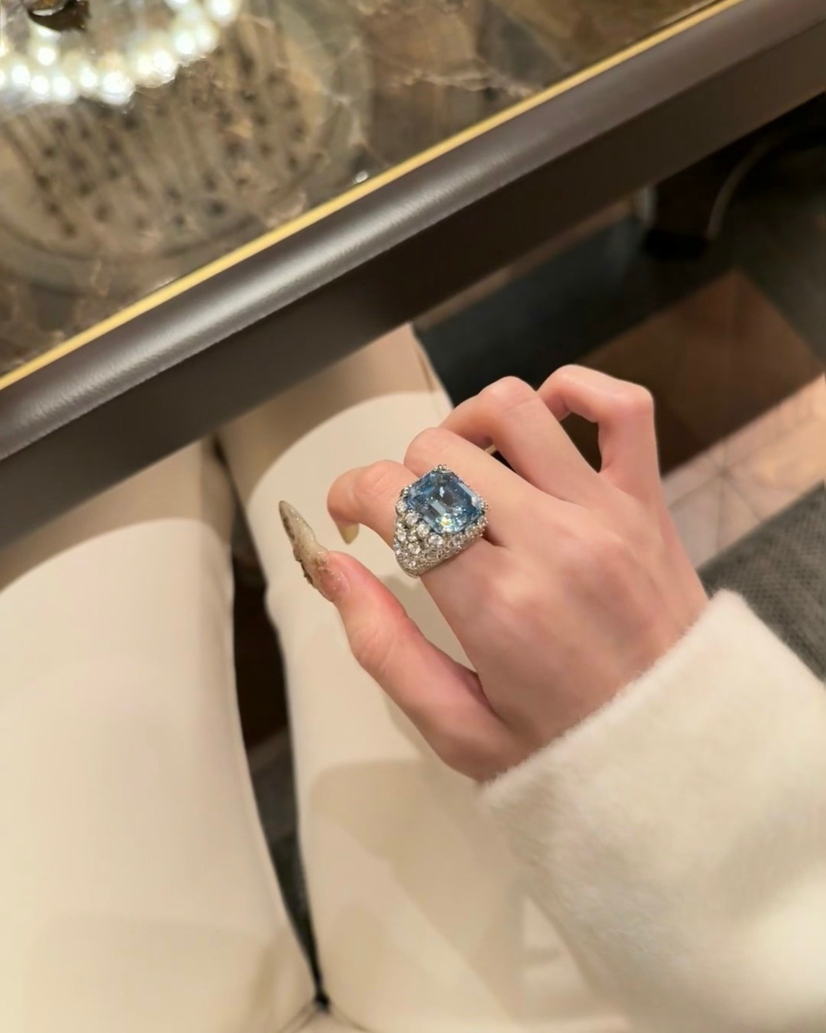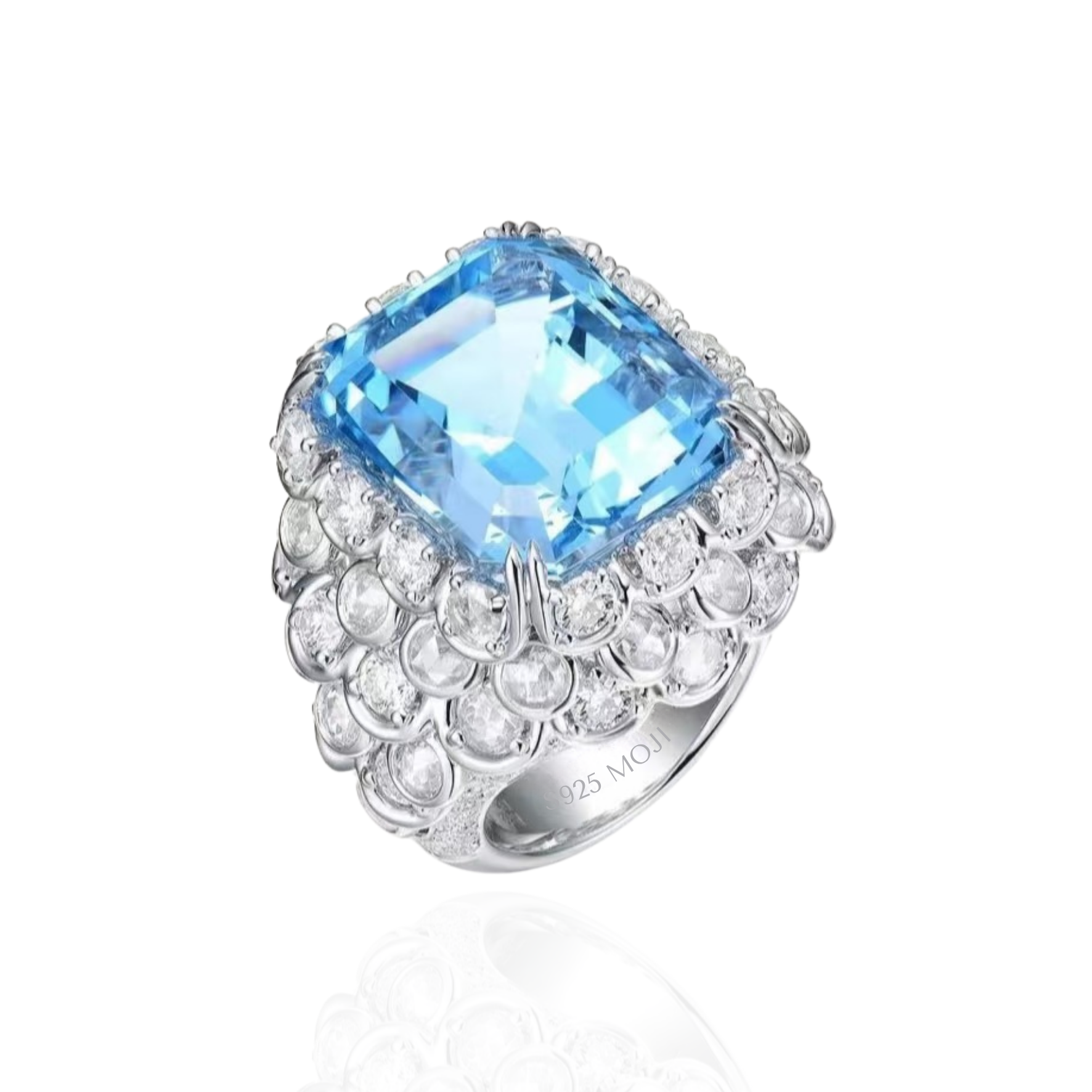 Piesa este dominată de un acvamarin albastru creat în laborator, tăiat Emerald Cut, ce reflectă lumina în nuanțe reci, nobile și irezistibil elegante.