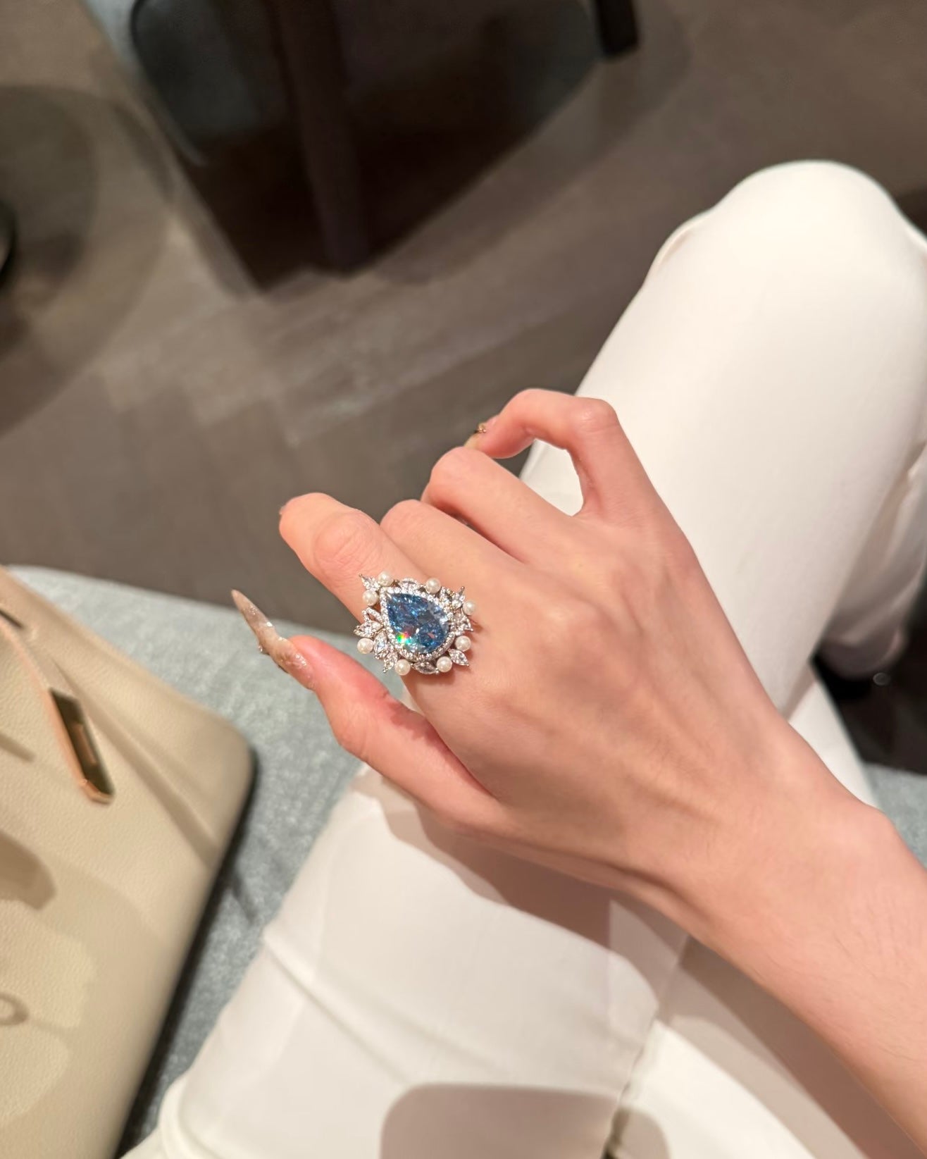 Piatra centrală, un zirconiu albastru de 11×15 mm, tăiat pear cut, devine centrul absolut al atenției. Nuanța intensă și cristalinitatea pietrei sunt accentuate de o dublă coroană decorativă: un halo de zirconii marquise și rotunde care amplifică lumina, alături de perle dispuse armonios pentru un contrast rafinat și o textură subtilă.