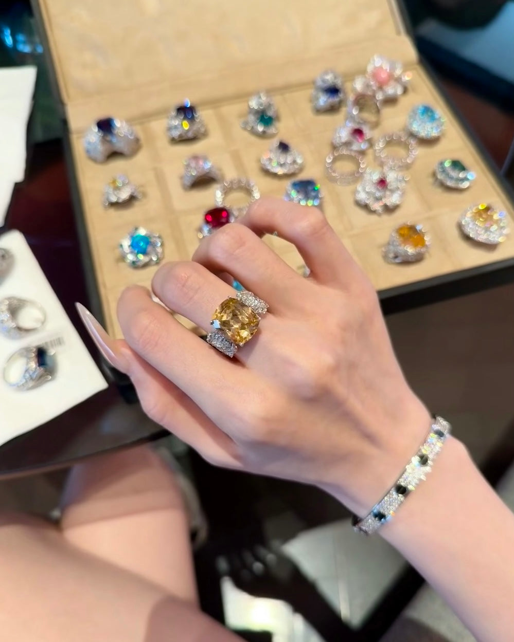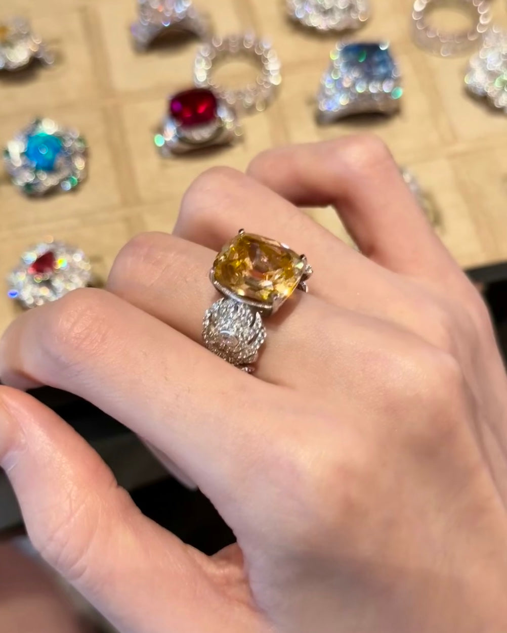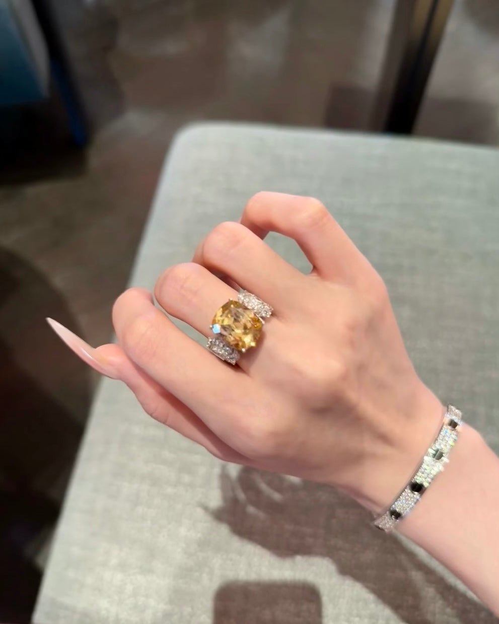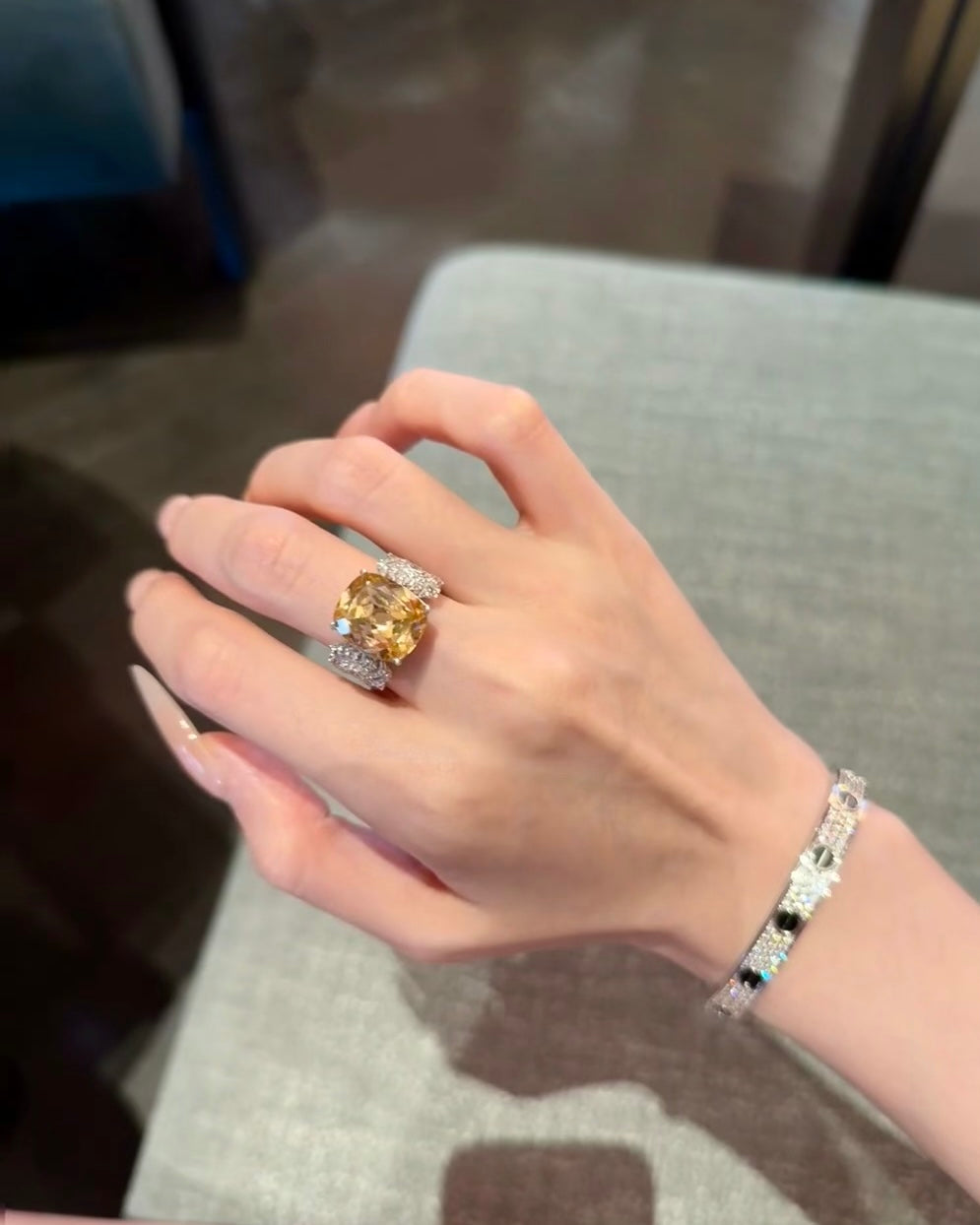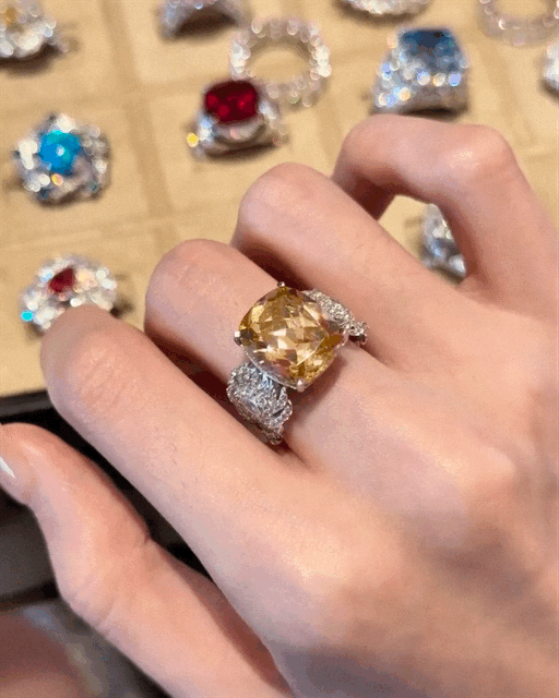 În centrul piesei se află o piatră impresionantă de 14 × 16 mm, tăietură cushion cut, într-o nuanță caldă de șampanie-piersică. Reflexele sale aurii și roz creează un joc delicat de lumină, care contrastează superb cu strălucirea rece a monturii placate cu rodiu.