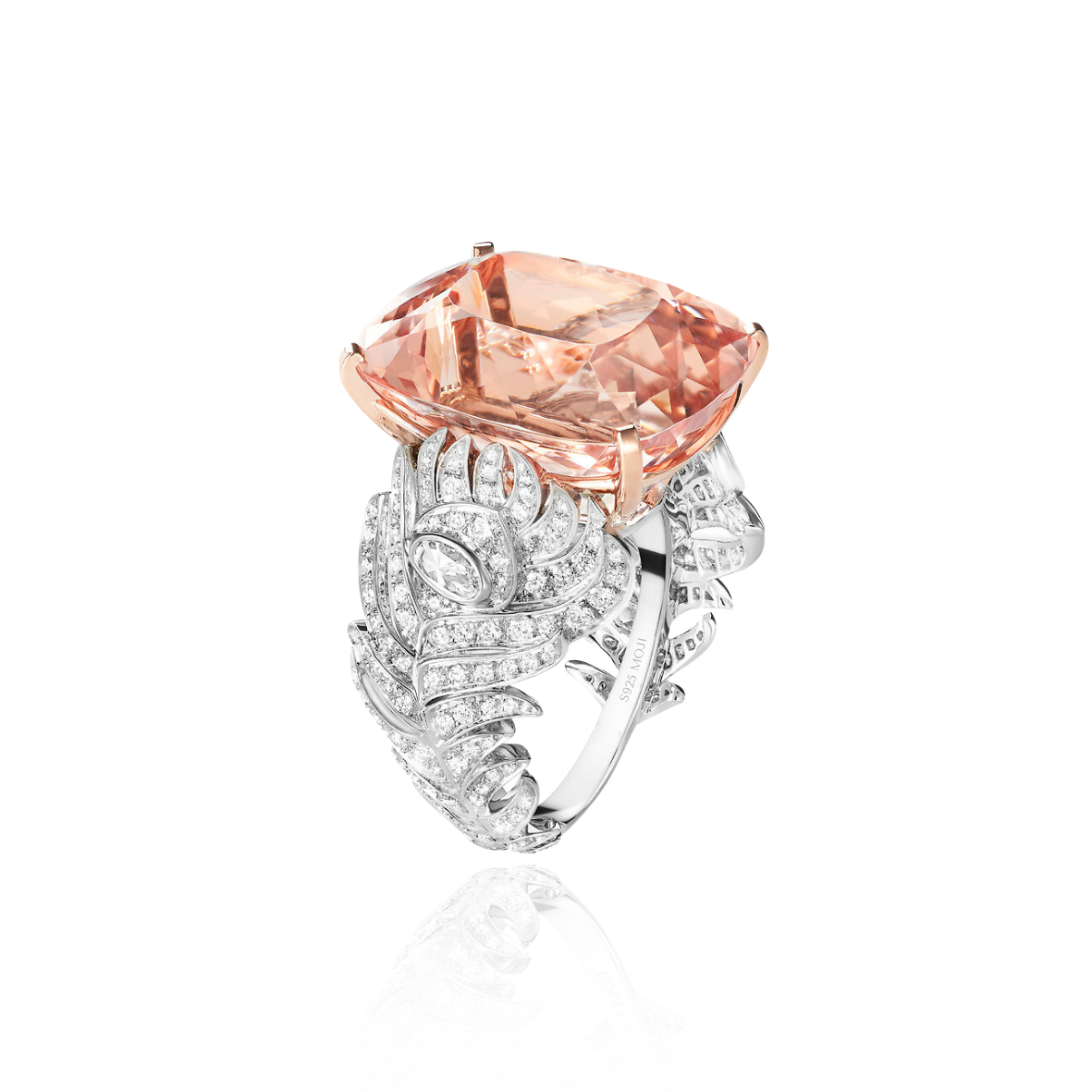 „Blush Feather Majesty” este un inel couture spectaculos, inspirat de grația penelelor de păun și de eleganța rară a nuanțelor blush-peach. Modelat ca o pană regală înfășurată în jurul degetului, inelul îmbină fluiditatea organică a designului natural cu luxul suprem al detaliilor pavé.