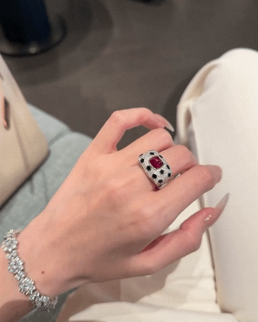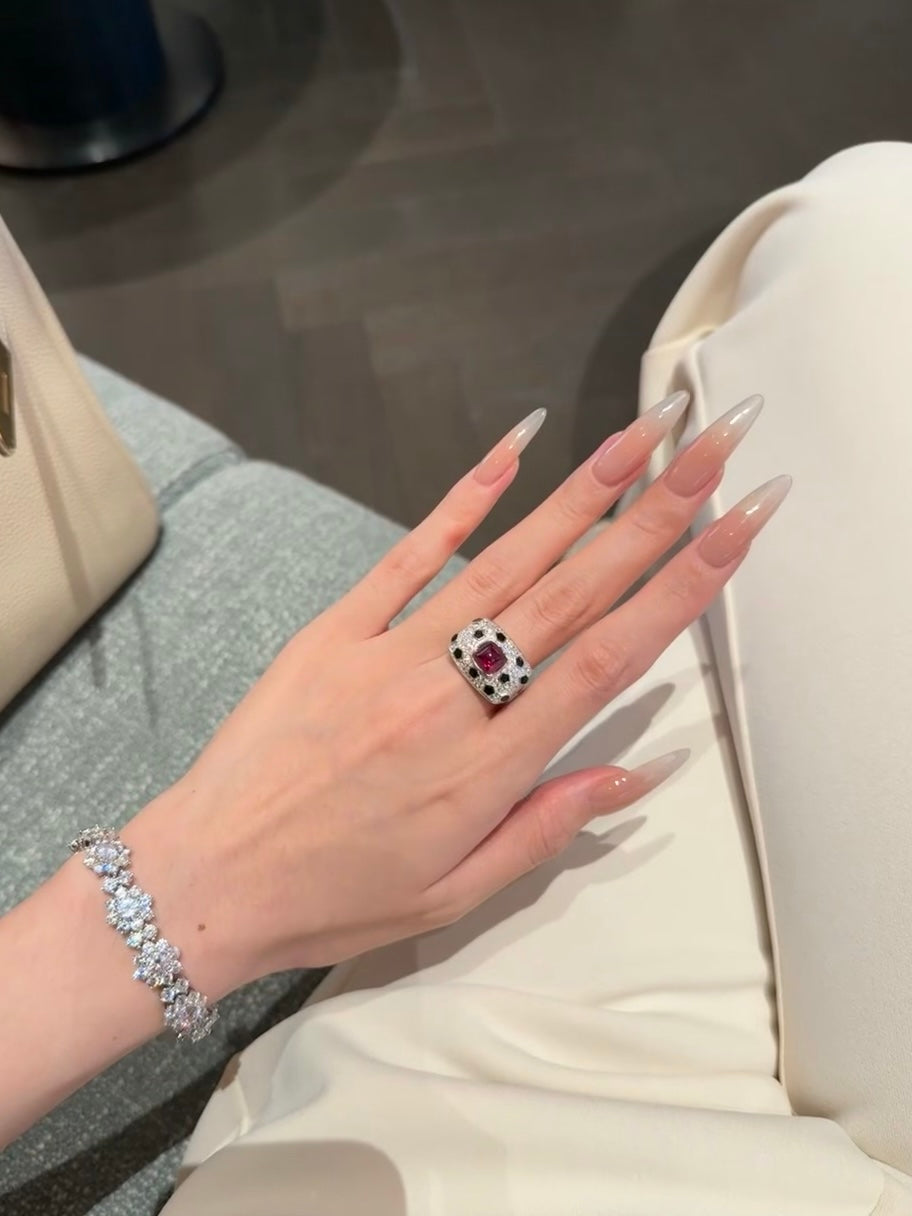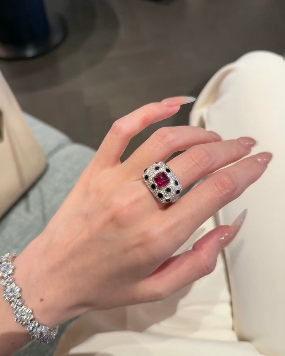 „Crimson Royal Cube” este un inel cu personalitate puternică și design arhitectural, dedicat femeilor care iubesc bijuteriile cu volum, contrast și identitate. Montura solidă este încoronată cu o piatră centrală roz de 7×7 mm, tăiată sugar loaf cut — un stil de șlefuire rar și sofisticat, apreciat pentru suprafața bombată, netedă și luminozitatea profundă pe care o oferă.