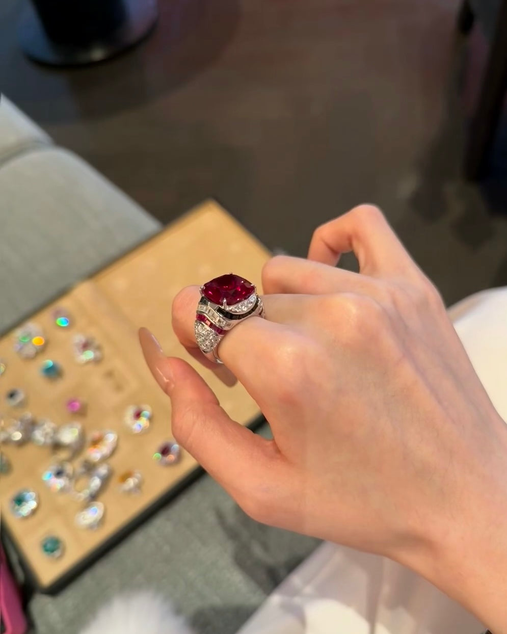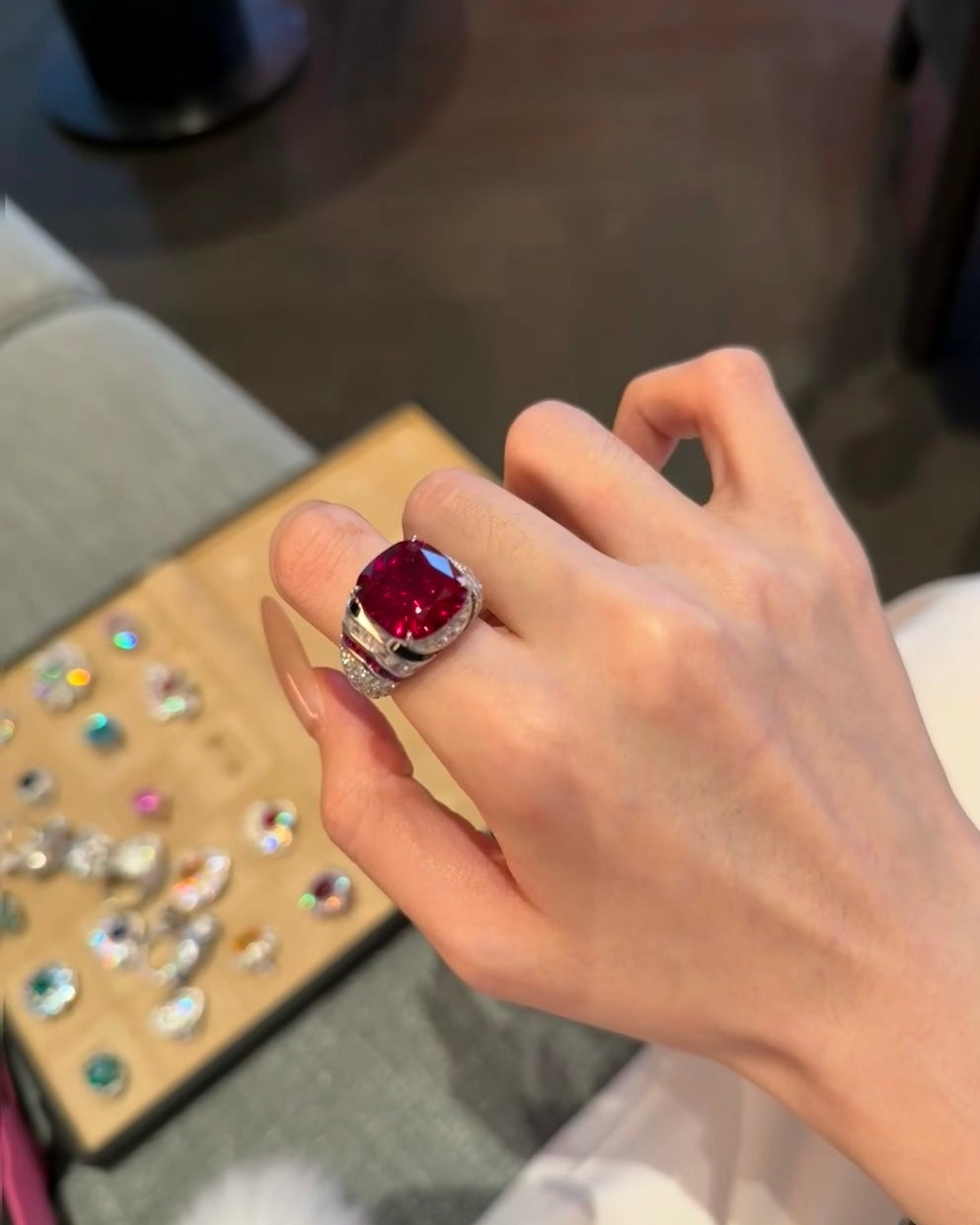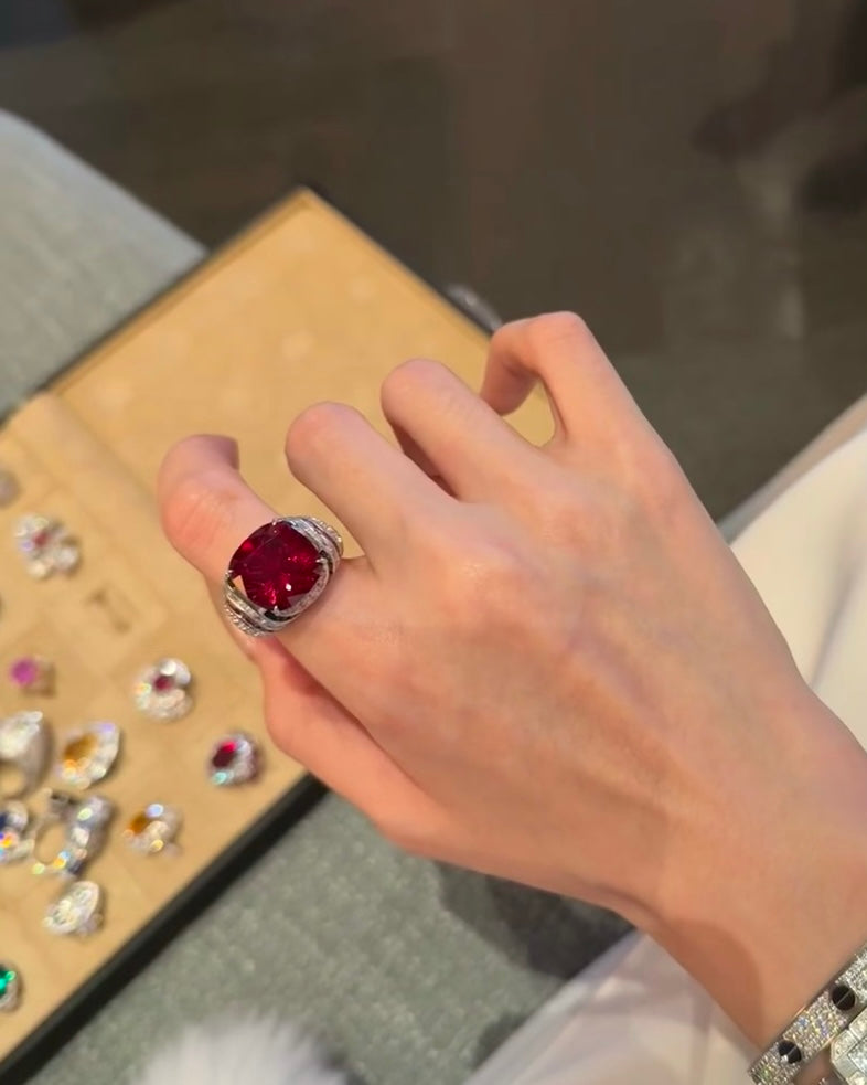 Montura solidă încadrează piatra ca pe un tron regal: linii sculpturale, volume stratificate și inserții de zirconii albe pavé creează un efect tridimensional de lux și putere. Elementele emailate în negru și roșu adaugă profunzime grafică, accentuând forma în trepte și conferind piesei un aer modern, dramatic.