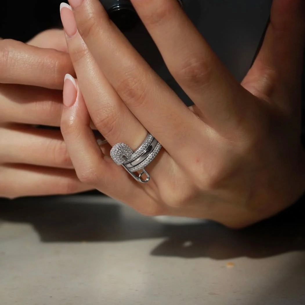 Purtați acest inel cu logo MOJI, încrustat cu pietre strălucitoare Zirconium. Designul cu ac de siguranță, va adăuga o notă unică și jucăușă stilului dvs.. Combinați-l cu alte inele MOJI pentru un aspect complet.
