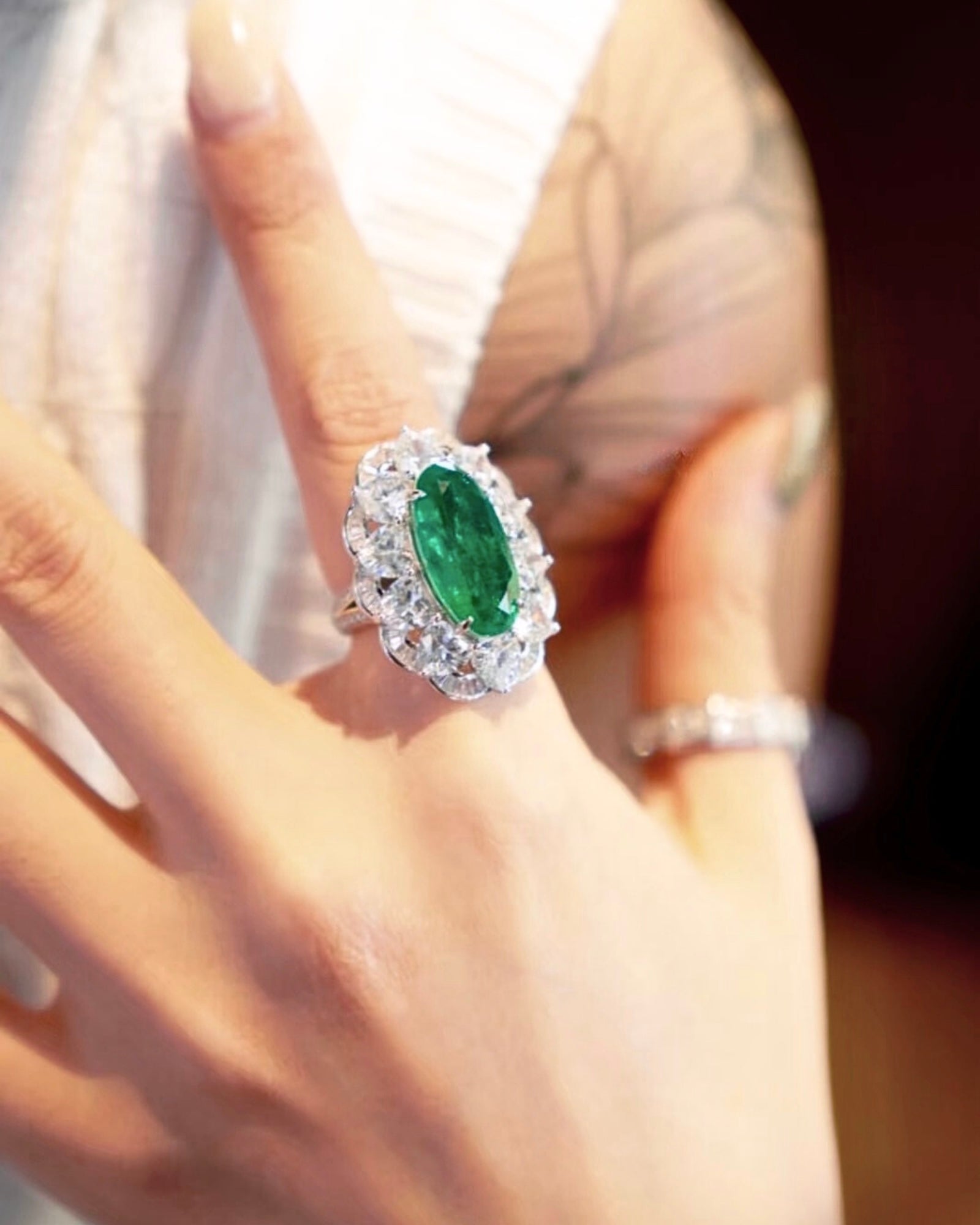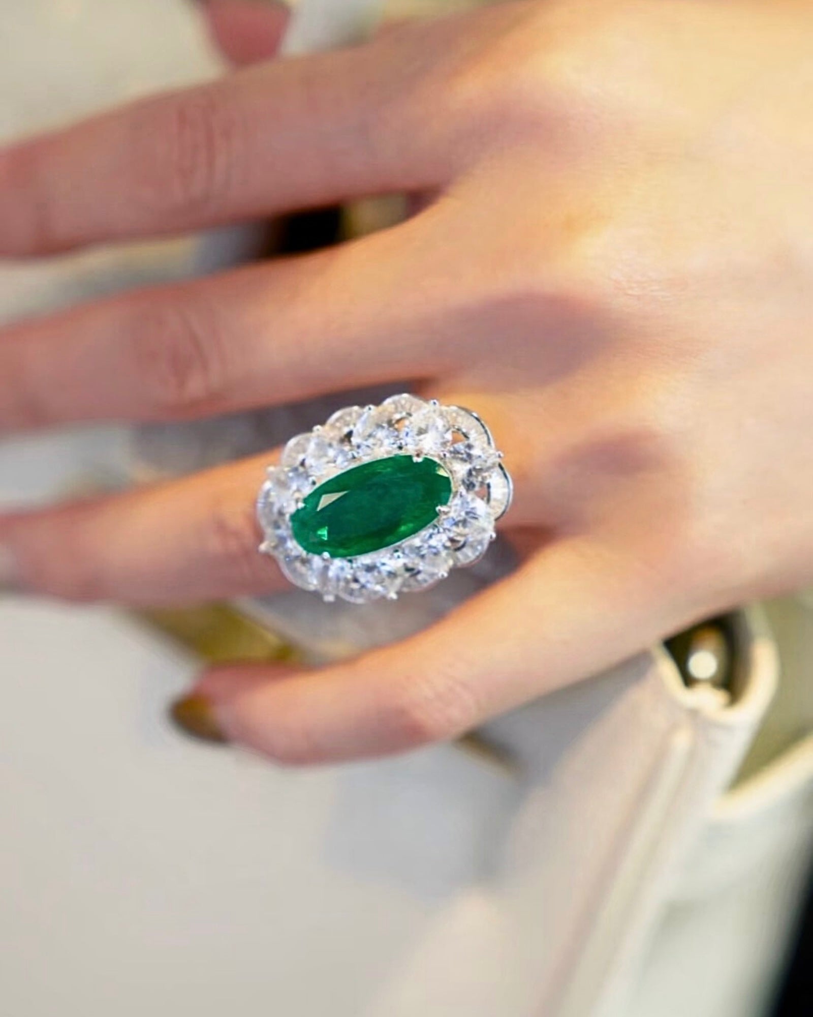 Un inel cu estetică clasic regală, creat pentru femeia care iubește bijuteriile elegante, cu prezență. Piesa este construită în jurul unei pietre centrale de 12 × 18 mm, zirconiu verde tăiat oval cut, a cărei nuanță intensă amintește de smaraldele purtate în marile case regale.