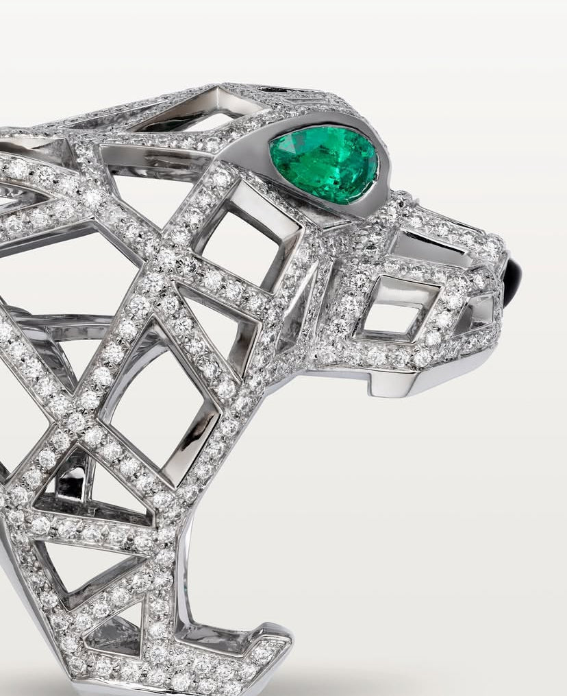 Cap de panteră fin sculptat, cu ochi din zirconiu verde ce adaugă un accent vibrant