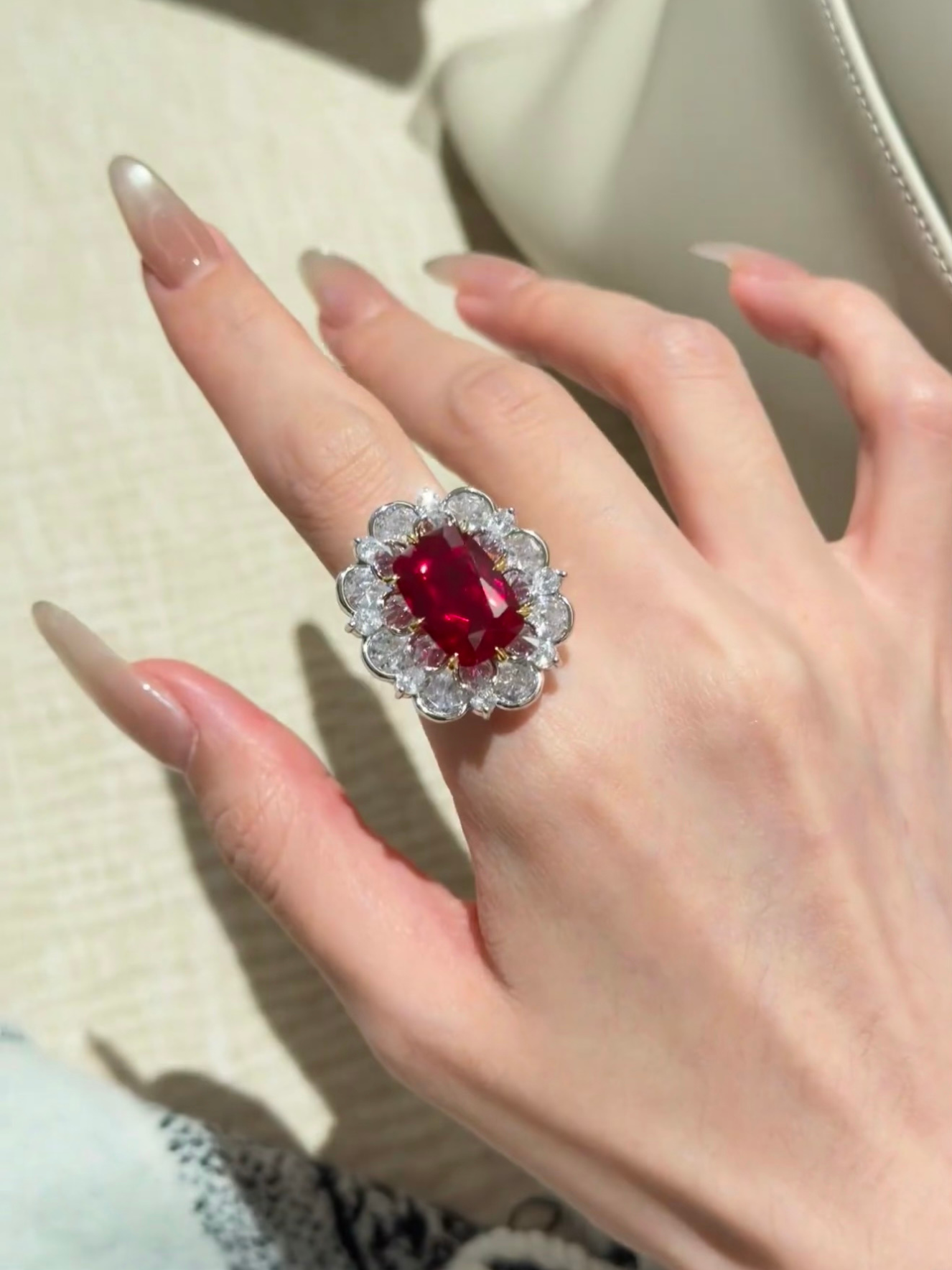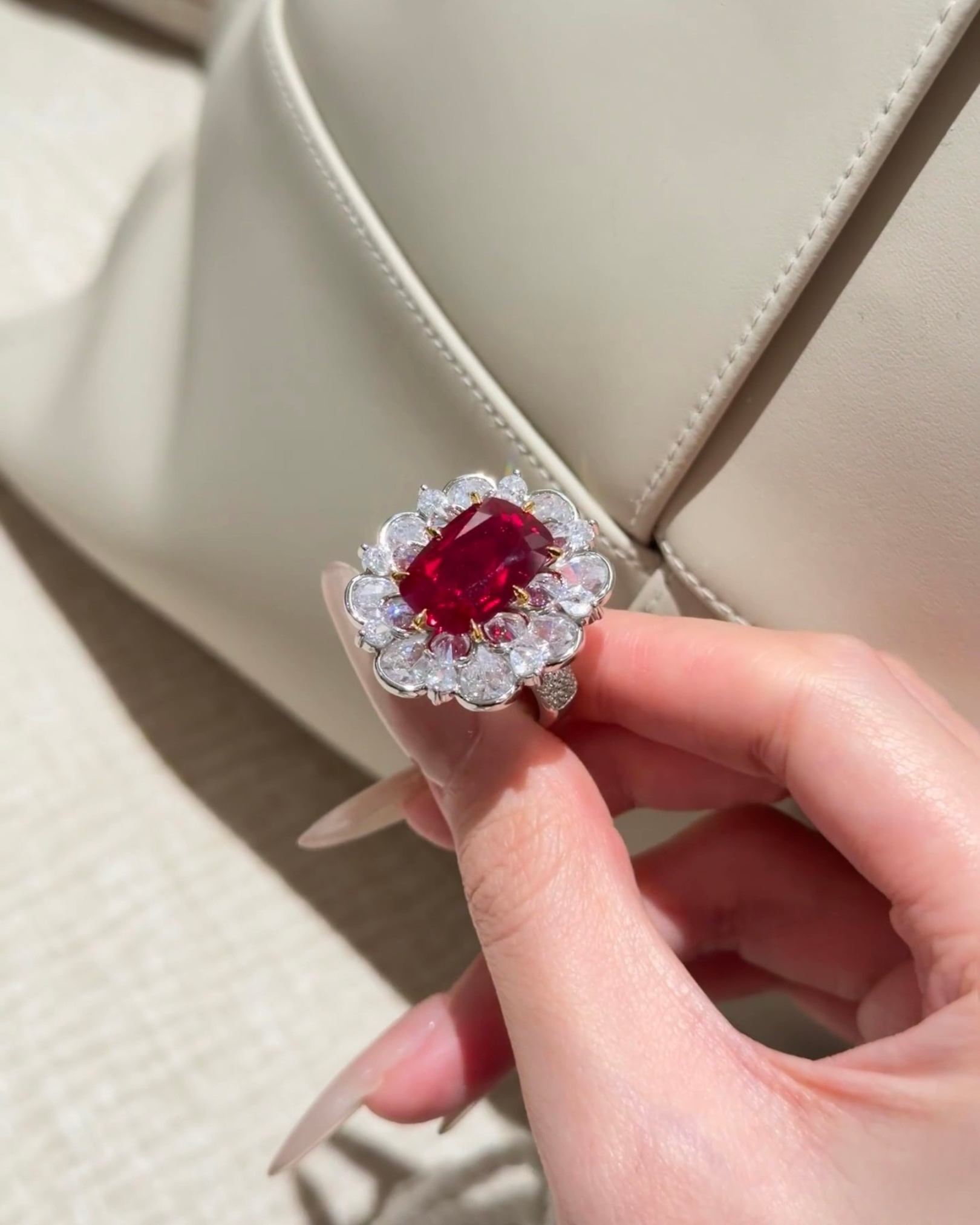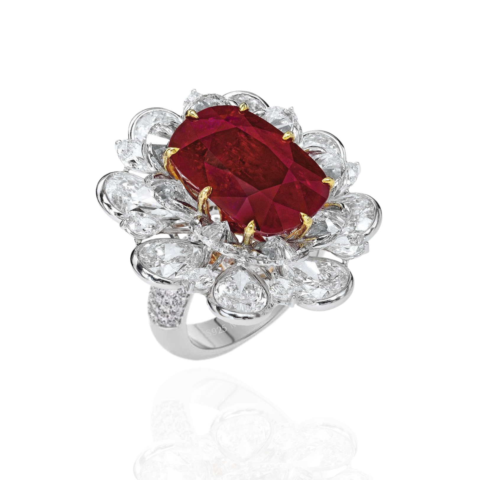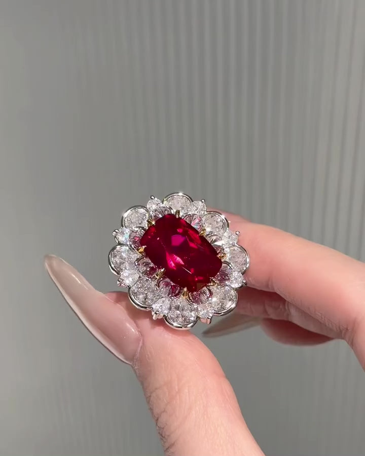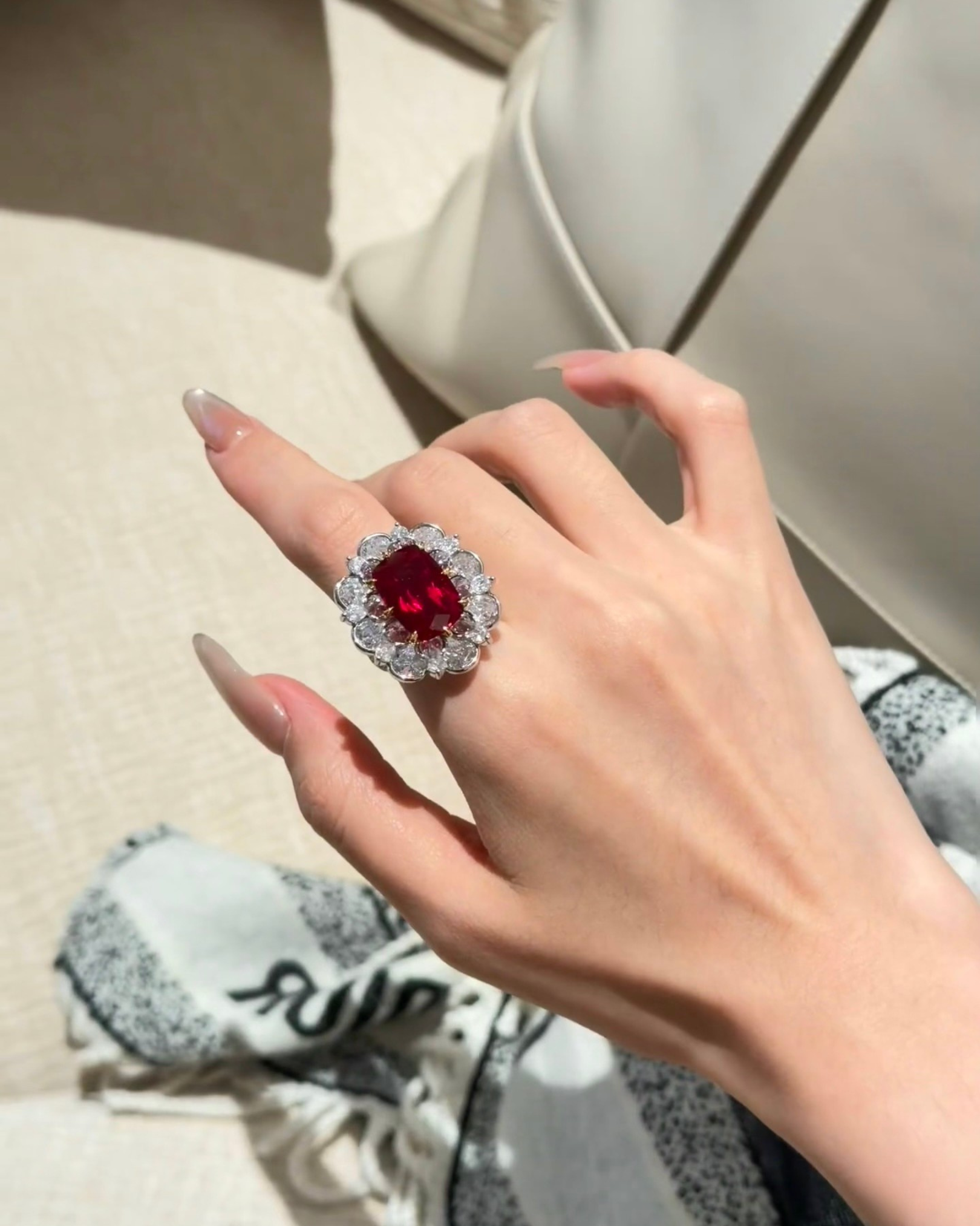 Realizat din argint 925 de calitate superioară, acest inel poartă în centrul său un rubin roșu creat în laborator, o piatră care simbolizează iubirea pură, vitalitatea și curajul. Rubinul de laborator are aceeași compoziție chimică și strălucire intensă ca rubinul natural, fiind crescut în condiții controlate pentru claritate perfectă și o culoare profundă, uniformă.