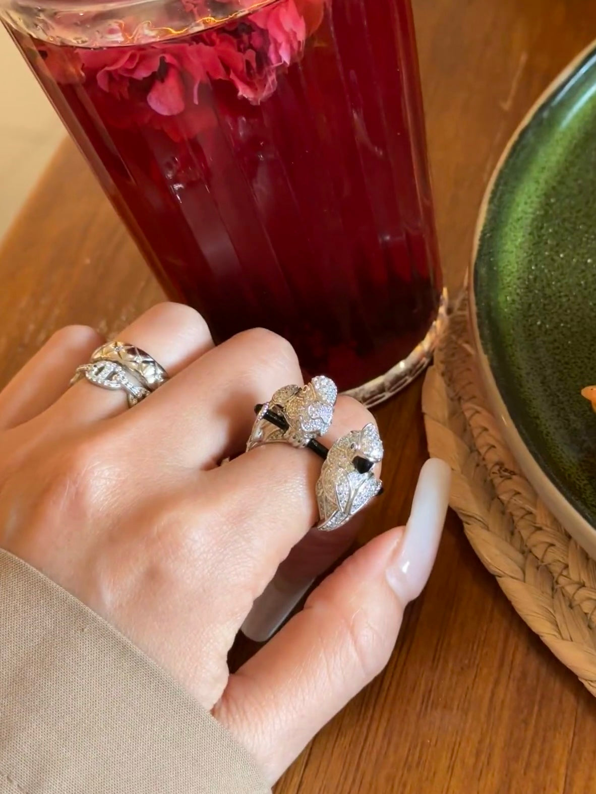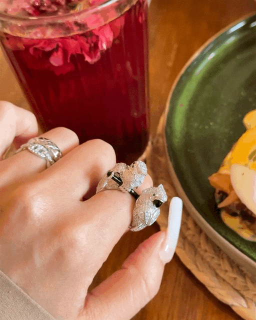 „Royal Parrot Duo” este o bijuterie sculpturală impresionantă, creată pentru femeia care apreciază simbolistica libertății, rafinamentul detaliilor și eleganța artistică. Inelul reprezintă doi papagali stilizați, realizați cu un nivel excepțional de finețe, fiecare acoperit în întregime cu zirconii albe pavé ce creează un joc intens de lumină și strălucire.