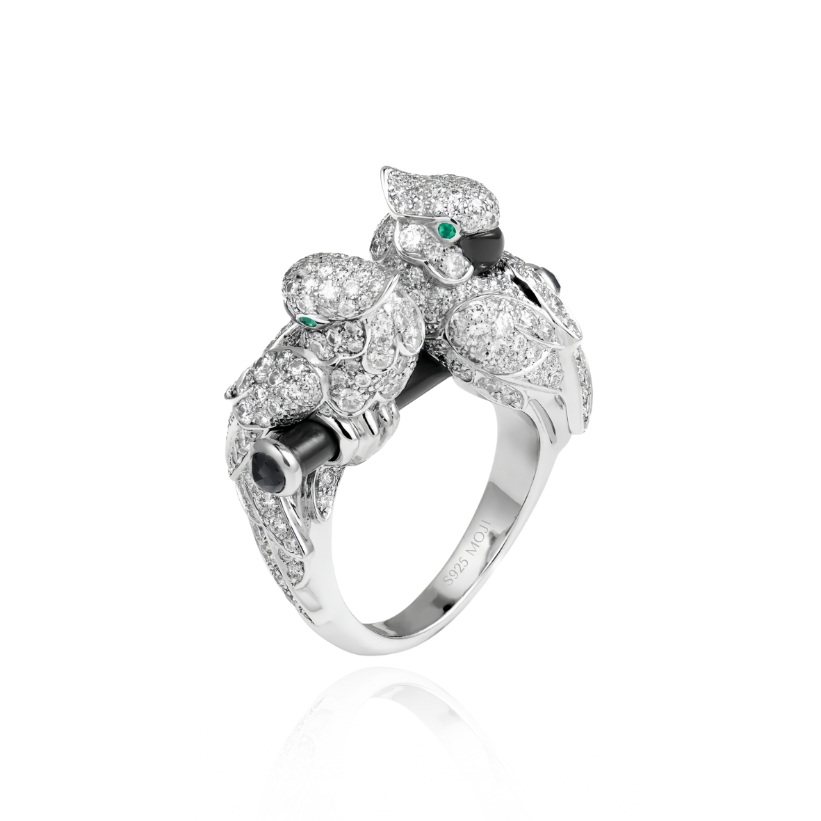 Păsările sunt poziționate pe o bară decorativă lucioasă, contrastantă, care conferă volum designului și evidențiază siluetele tridimensionale. Ochii papagalilor sunt accentuați cu zirconii verzi, adăugând o notă subtilă de expresivitate. Forma lor curbată încadrează degetul într-o manieră artistică și elegantă, transformând acest inel într-o piesă unică.