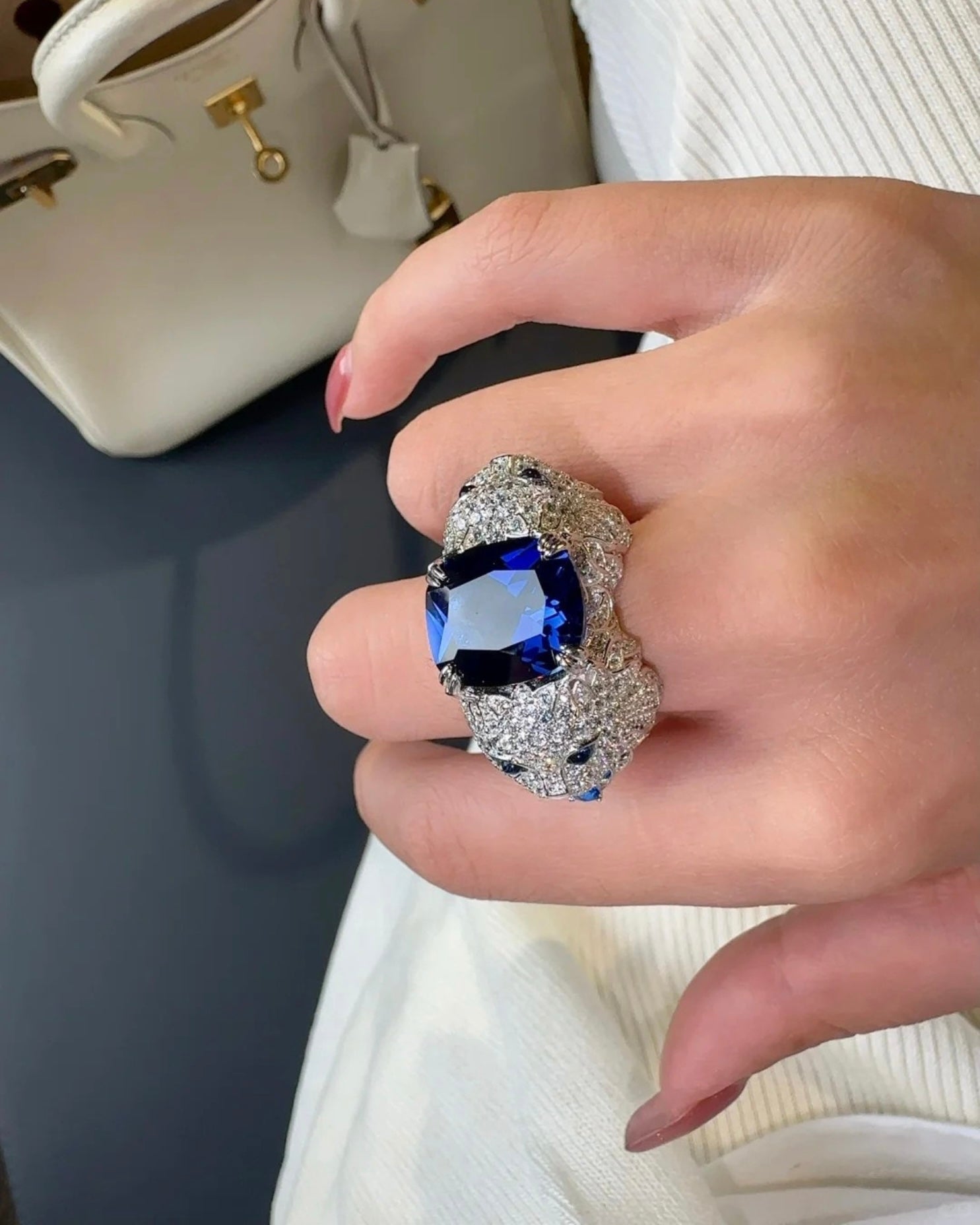„Sapphire Imperial Feline” este una dintre cele mai impresionante piese sculpturale din colecție — un inel cu prezență puternică, lucrat ca o veritabilă mini-sculptură de artă. Designul înfățișează o felină regală, modelată în detaliu, cu blană pavé din zirconii albe și accente albastre care îi accentuează expresivitatea și eleganța.